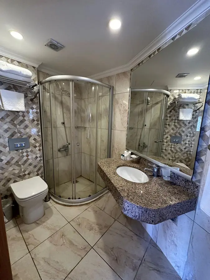 Ekonomik odalar, balkonsuzdur ancak ortak teraslıdır. Misafirin ihtiyaç duyması durumunda bebek yatağı temin edilir.